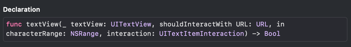 textView(_:shouldInteractWith:in:interaction:)의 매개변수로는 textView, URL, characterRange, interaction이 있네요! 다른 매개변수들은 익숙한데, 낯선 매개변수가 하나 보입니다!