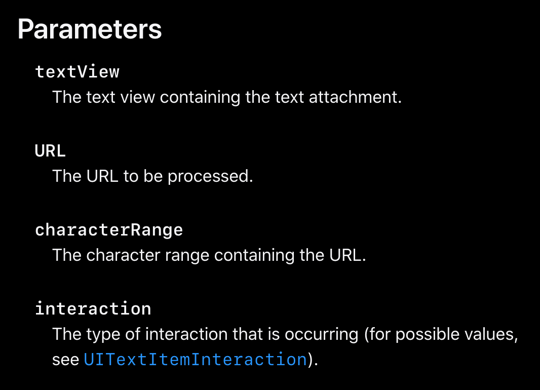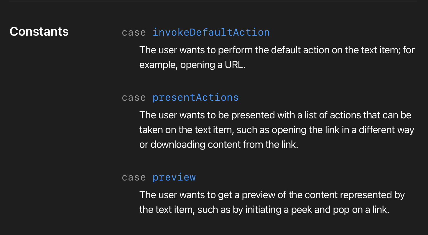 interaction.. 이 친구의 값를 어찌저찌 이용해서 링크도 연결하고 하는 것 같은 느낌이 드는데.. 자세히 들여보니 요 interaction친구는 UITextItemInteraction 타입의 value를 가진다고 하네요! 그럼 UITextItemInteraction 타입을 한번 들여다볼까요?