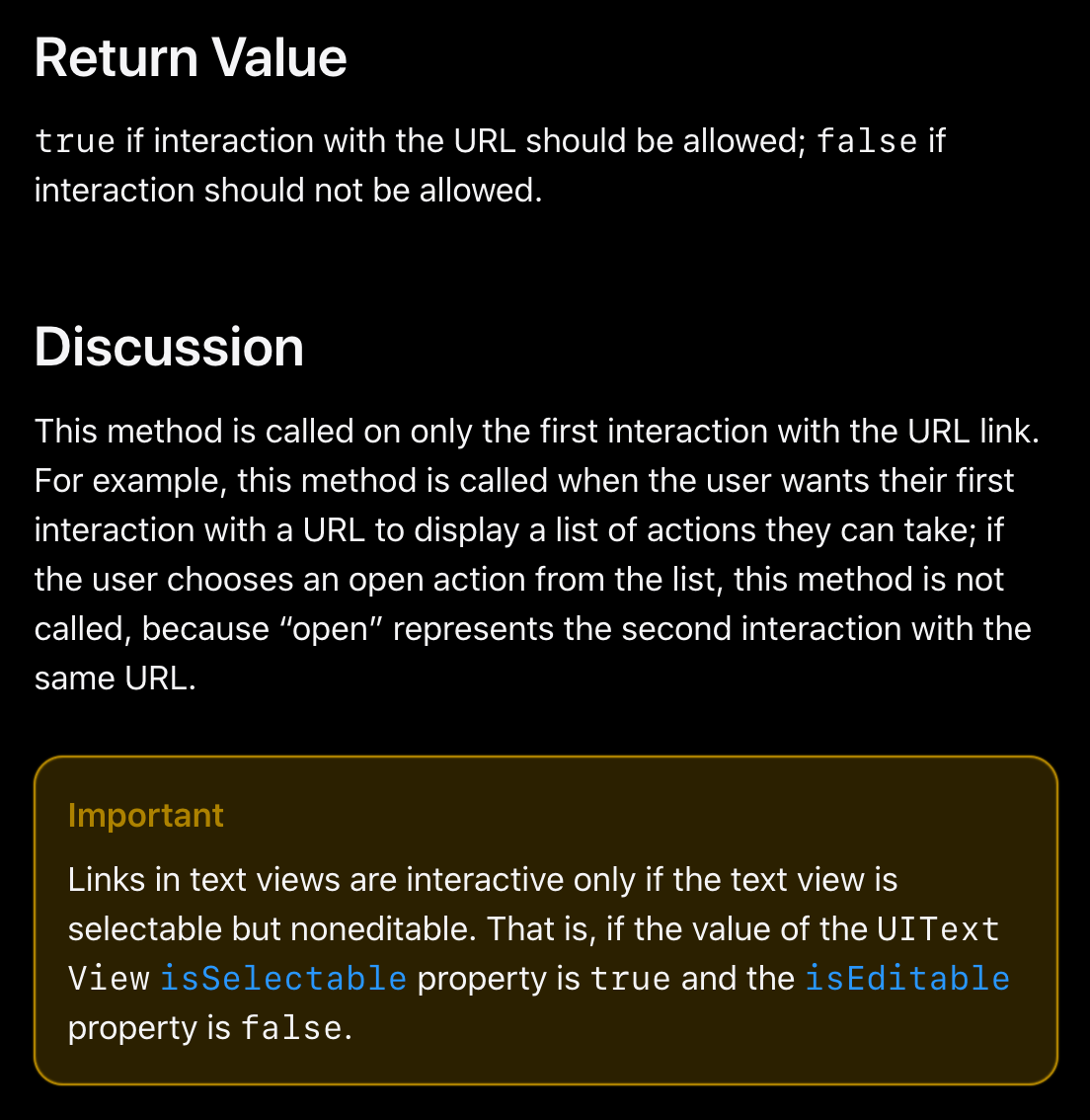 텍스트뷰 내 URL link와 interaction하는 메서드(지정된 텍스트 보기가 지정된 텍스트 범위에서 지정된 URL과 지정된 유형의 사용자 상호 작용을 허용하는지 여부를 대리자에게 묻는 메서드)를 사용할 수 있습니다.