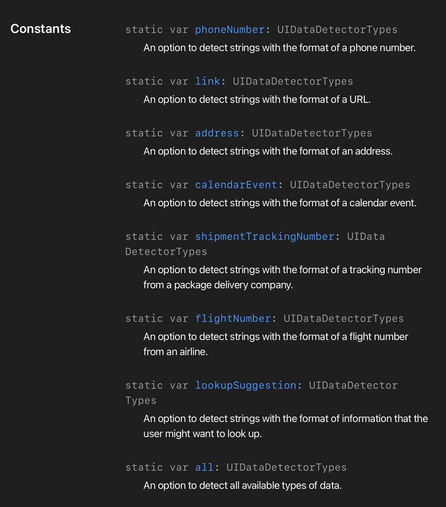 UIDataDetectorTypes가 감지할 수 있는 정보 유형은 phoneNumber, link, address, calendarEvent, shipmentTrackingNumber, flightNumber, lookupSuggestion, all 이 있네요!