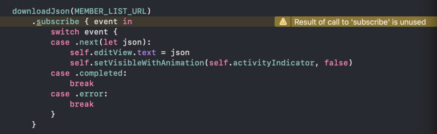 지금 보이는 이 워닝은 -> subscribe를 하고 나서 생기는 return값을 사용해주지 않아서 생기는 워닝입니다.