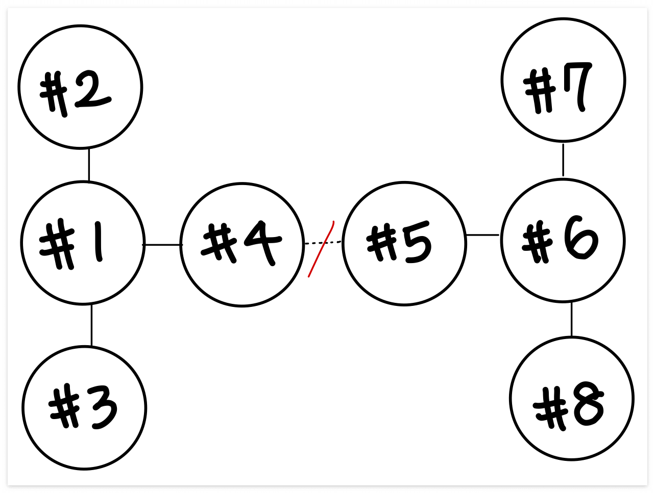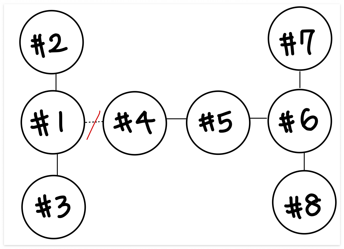 case1처럼 1과 4 사이를 끊었을 때 -> 각 송전탑의 개수는 3개 / 5개로 차이는 2이 된다. (5-6 사이를 끊어도 동일)