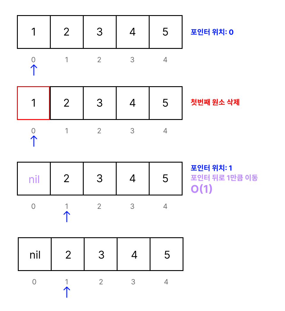 이렇게 포인터의 원리를 사용하여 dequeue를 해주면 시간복잡도가 O(1)이 되어 더 효율적인 dequeue를 수행할 수 있습니다!