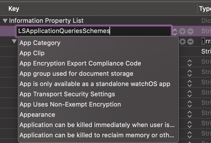 📌 info.plist에서 Information Property List 옆의 +버튼을 눌러서 LSApplicationQueriesSchemes를 치고 Enter를 눌러 추가해주세요!